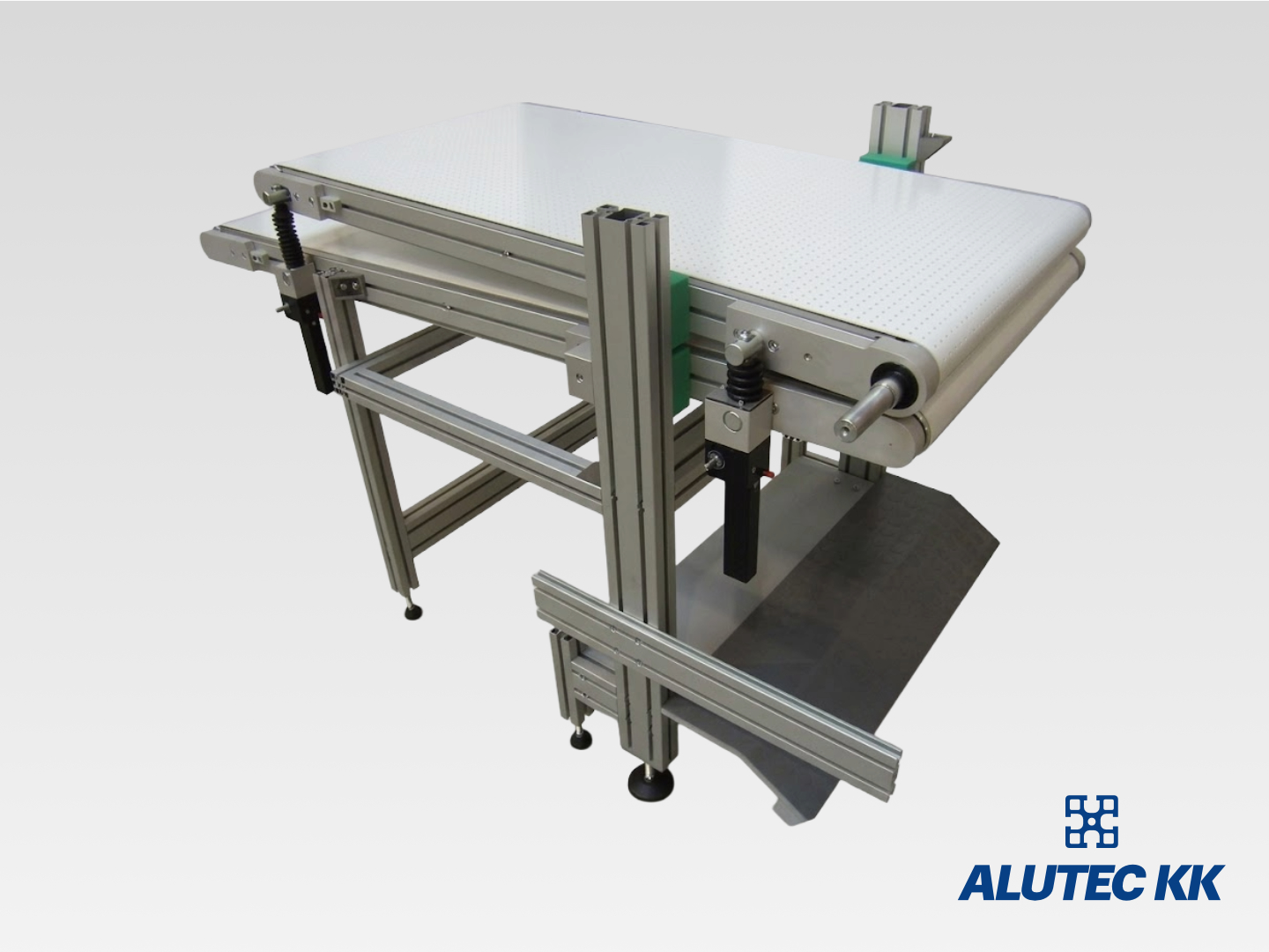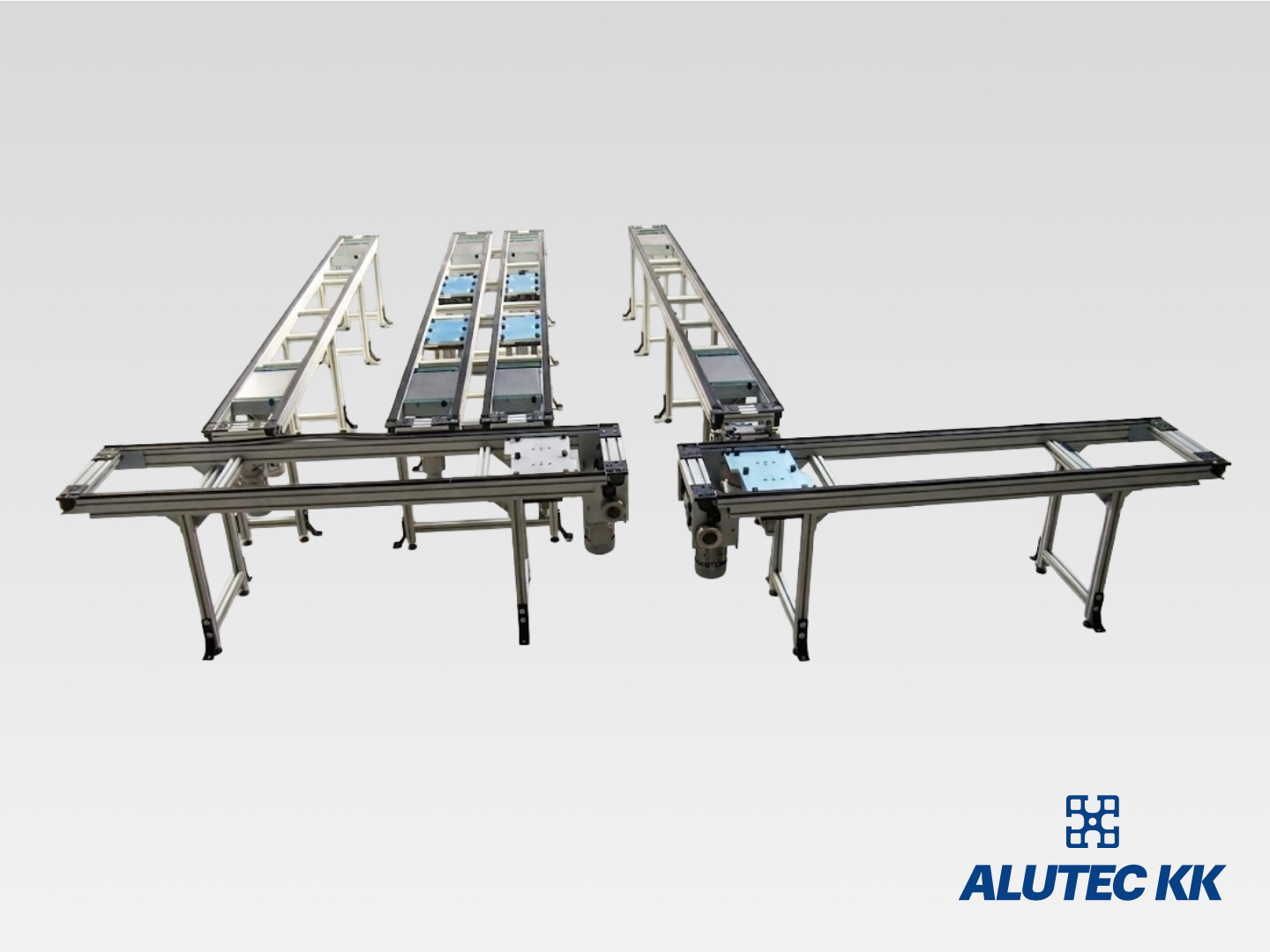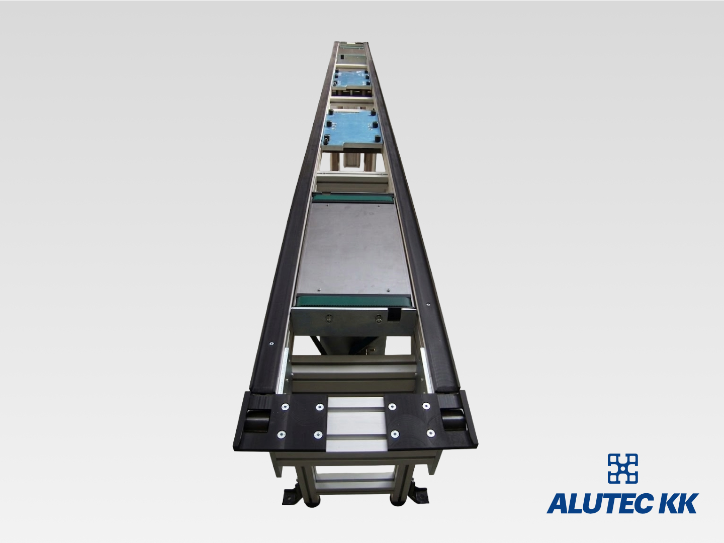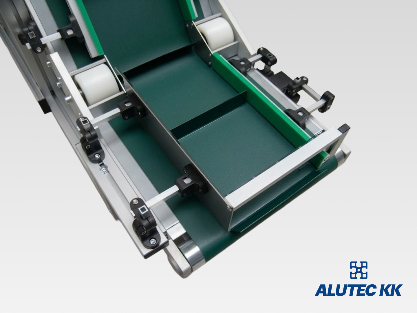 Conveyor system is a system for continuous movement of bulk and usually dry material, piece goods or integrated handling units. Units and types of conveyors can be combined and supplemented by other mechanical segments, thus creating conveyor systems. We use our own components and the structural aluminium system ALUTEC KK in designing our conveyors. This allows subsequent modularity of the entire system.